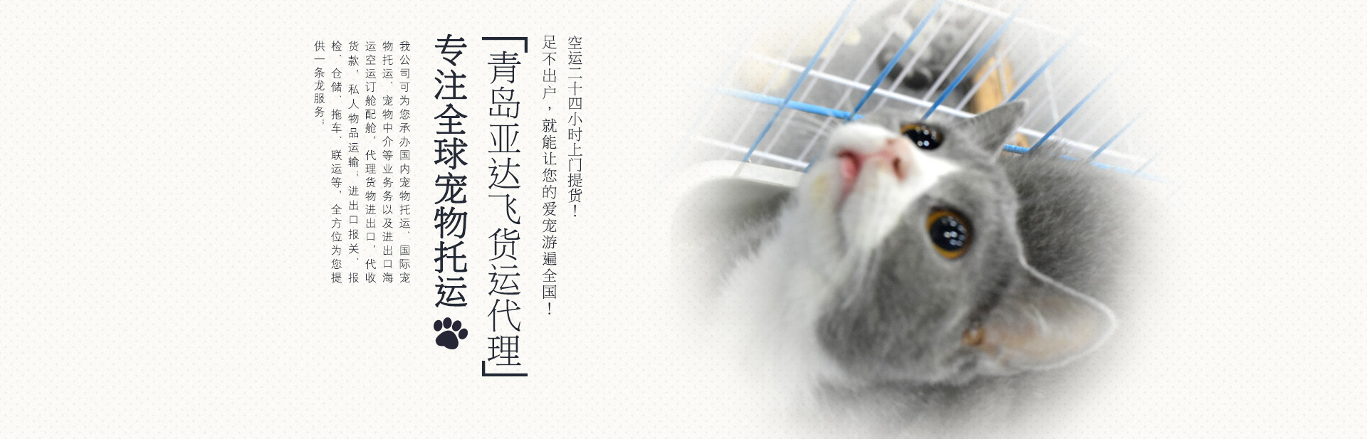 青岛亚达飞货运代理有限公司专注于全球宠物运输业务,同时承接加急运输业务:如海鲜,水果,配件等各种加急运输业务;遍及全球4000多家分支机构,积累了丰富的活体动物运输经验,得到了宠物行业的认可。